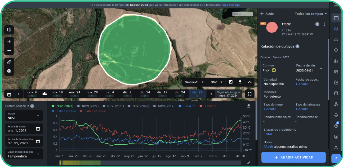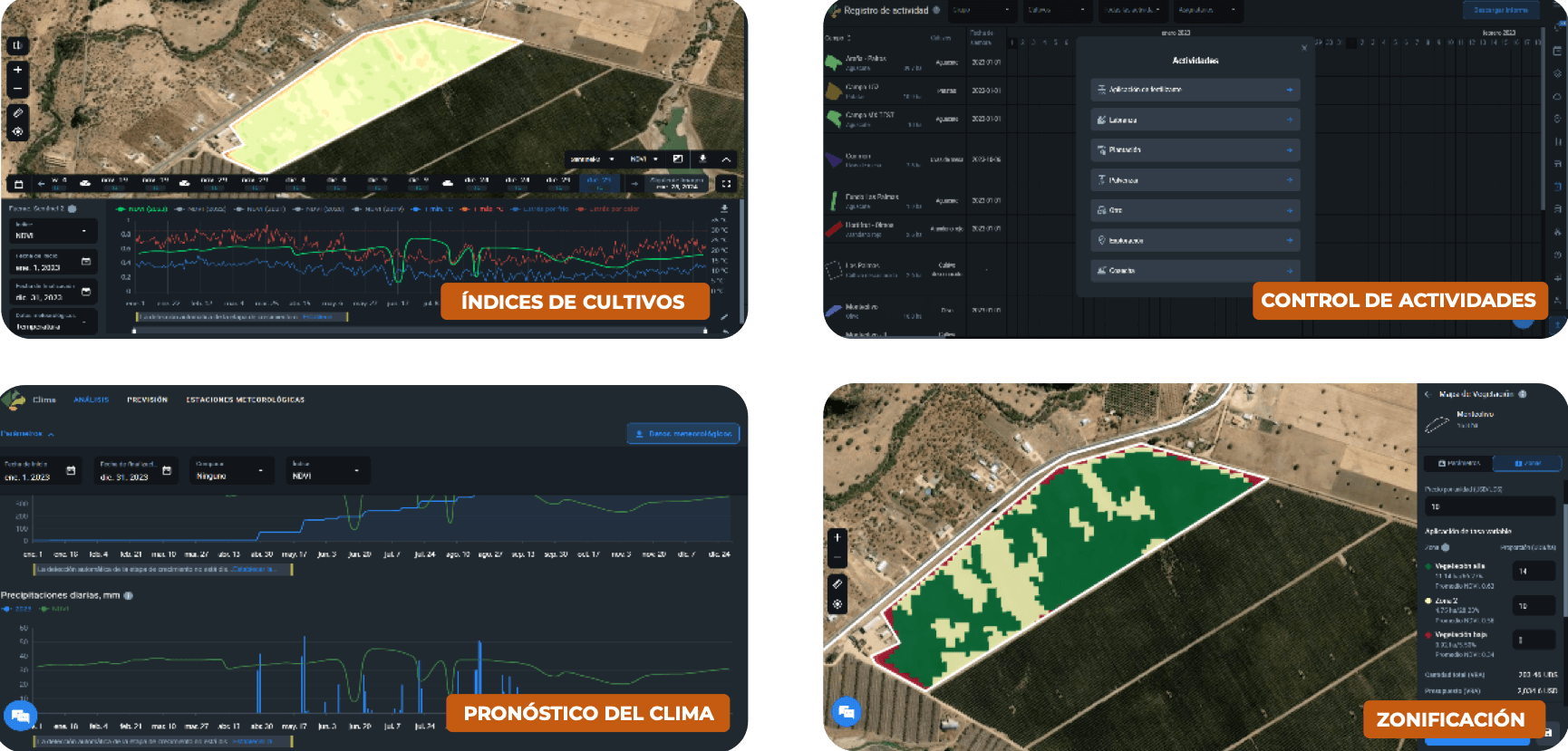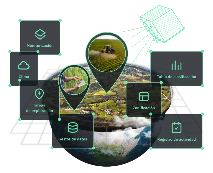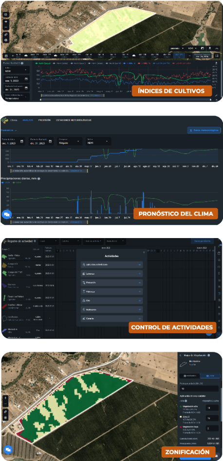 Mediante el uso de imágenes satelitales, ayudamos a los agricultores a administrar múltiples campos, reducir costos, optimizar recursos y tomar decisiones. Esta tecnología permite, por ejemplo, la medición y el control del estrés hídrico y el monitoreo de plagas.