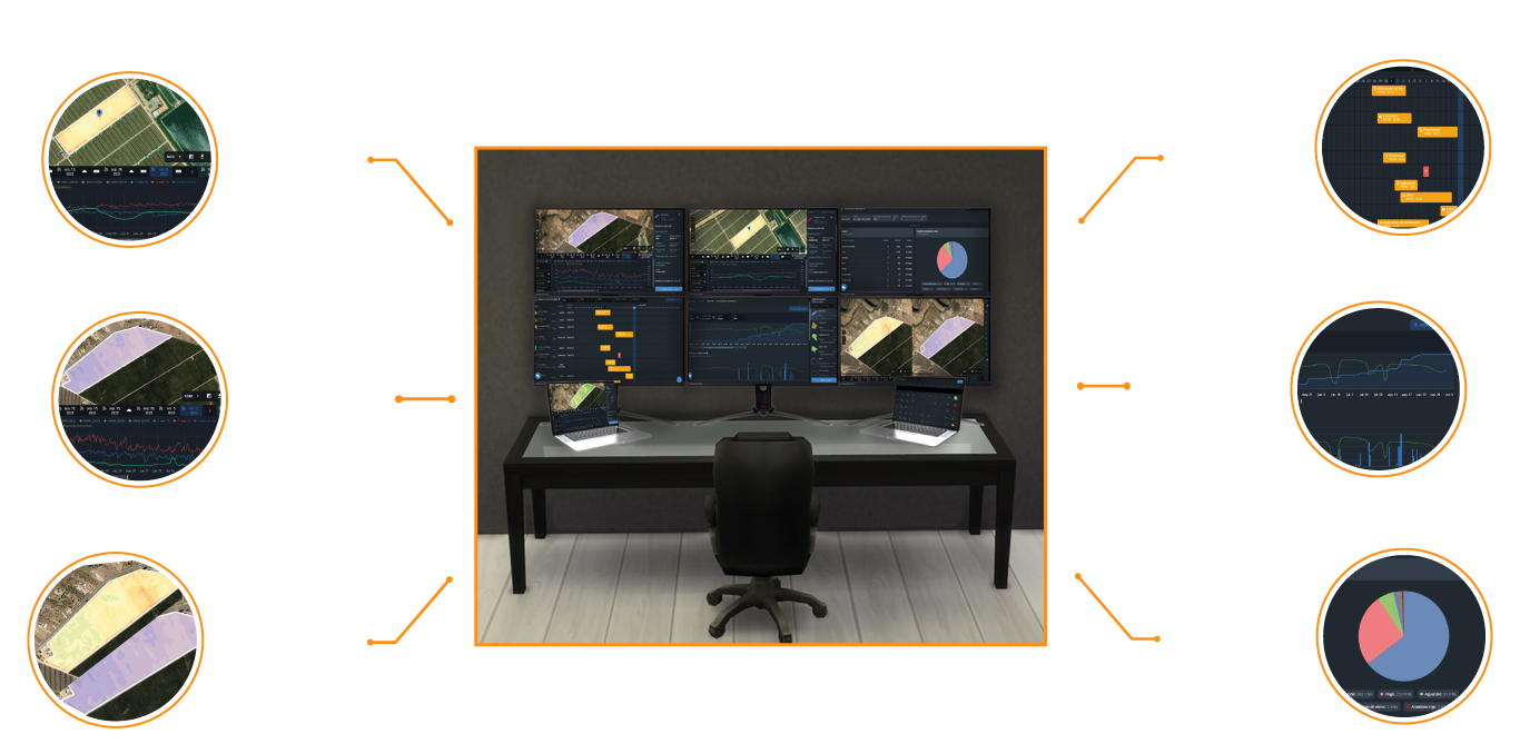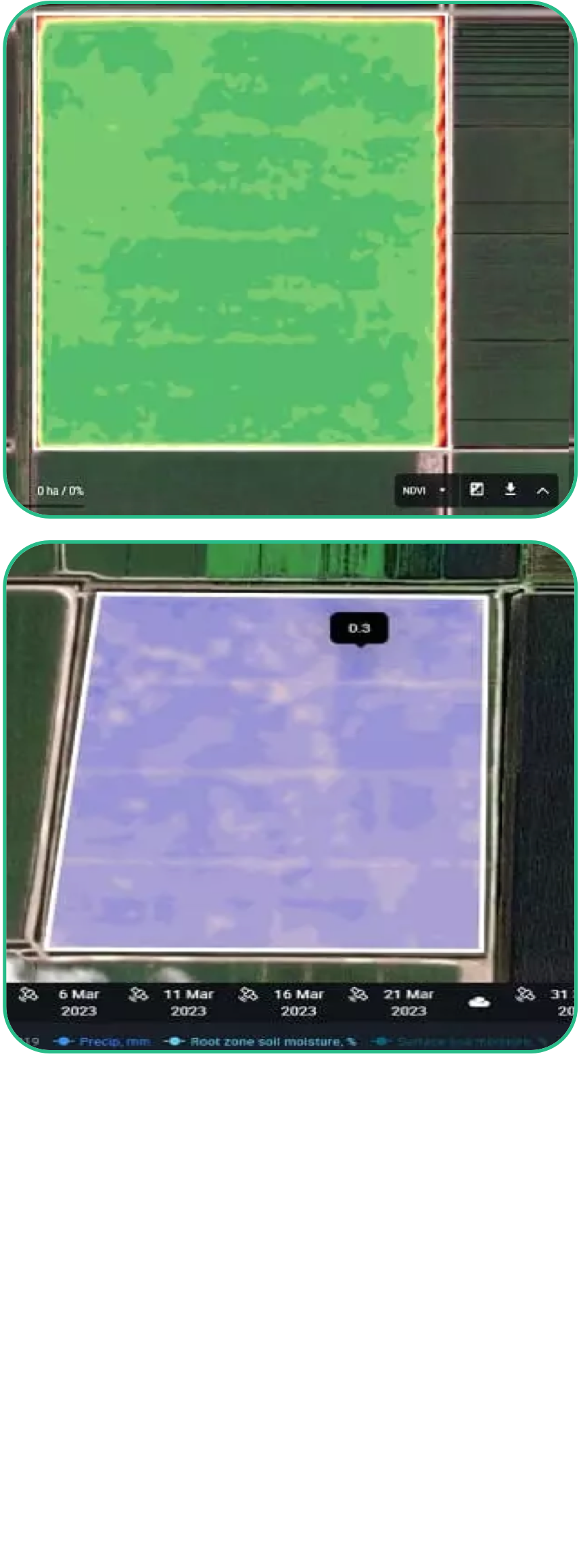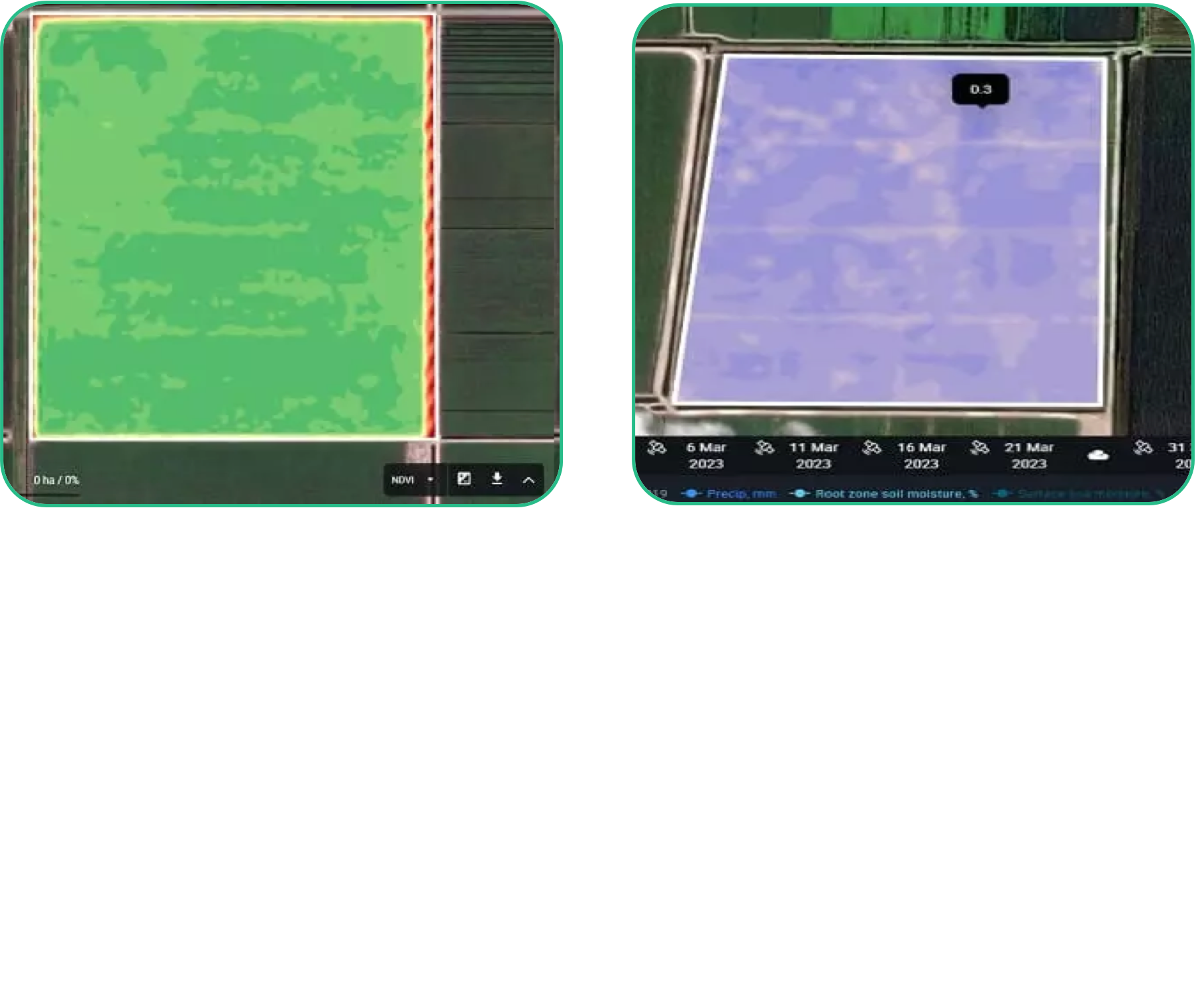 Mediante la aplicación de algoritmos propios, es posible desarrollar modelos eficaces y precisos de análisis de la humedad del suelo. Los mapas de humedad del suelo resultantes, tanto a nivel de superficie como a nivel radicular, pueden utilizarse para la monitorización diaria, la estimación precisa del rendimiento y el estudio de importantes tendencias climáticas.